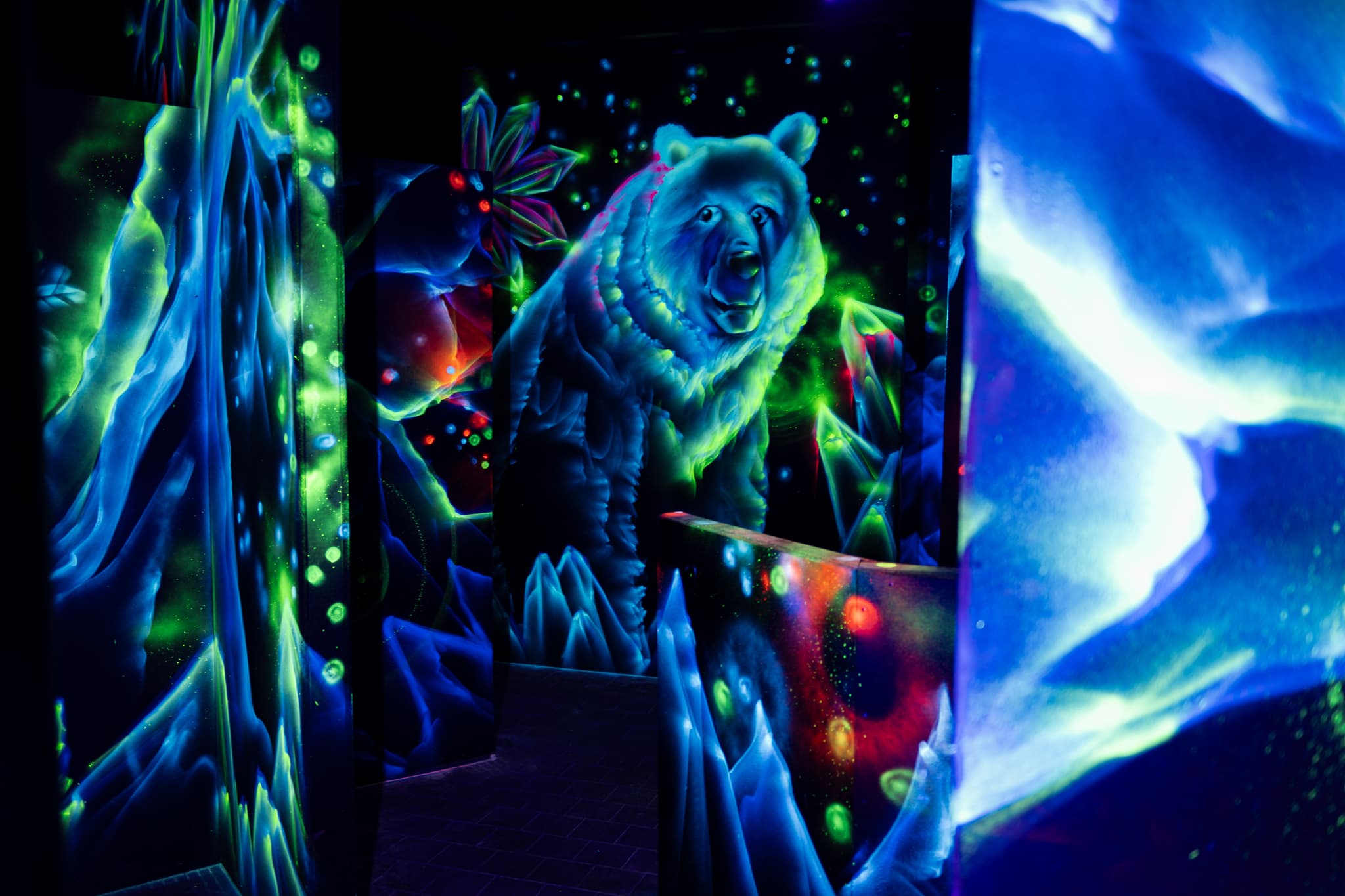 Schwarzlicht‑Minigolf findet in einer abgedunkelten Indoor‑Anlage statt. UV‑ und Neonfarben lassen Bahnen und Dekorationen leuchten und schaffen eine magische Atmosphäre.